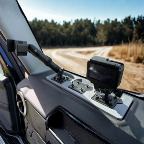 Upgrade your Ineos Grenadier interior with this custom dash mount. It installs directly into the factory dash holes for a clean, secure fit. Made with PPS Gf20 and PA6CF filament, it offers strength, heat resistance, and long lasting durability for off road use. It is ideal for cameras, phones, GPS units, and other accessories.